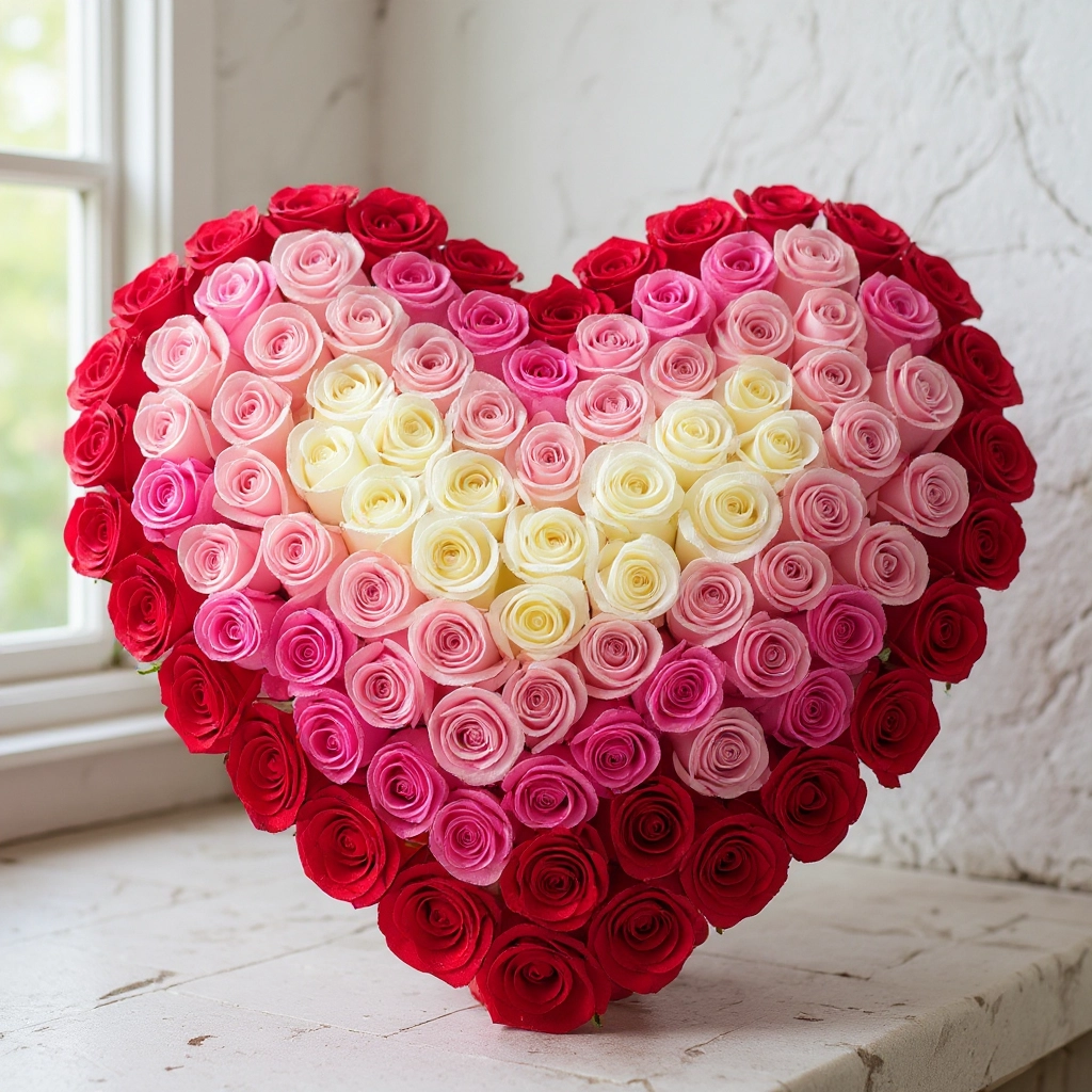 Rose heart 109. A large heart of multi color roses: white, lavender, pink, hot pink, and red. Can be done with different color roses or one solid color.